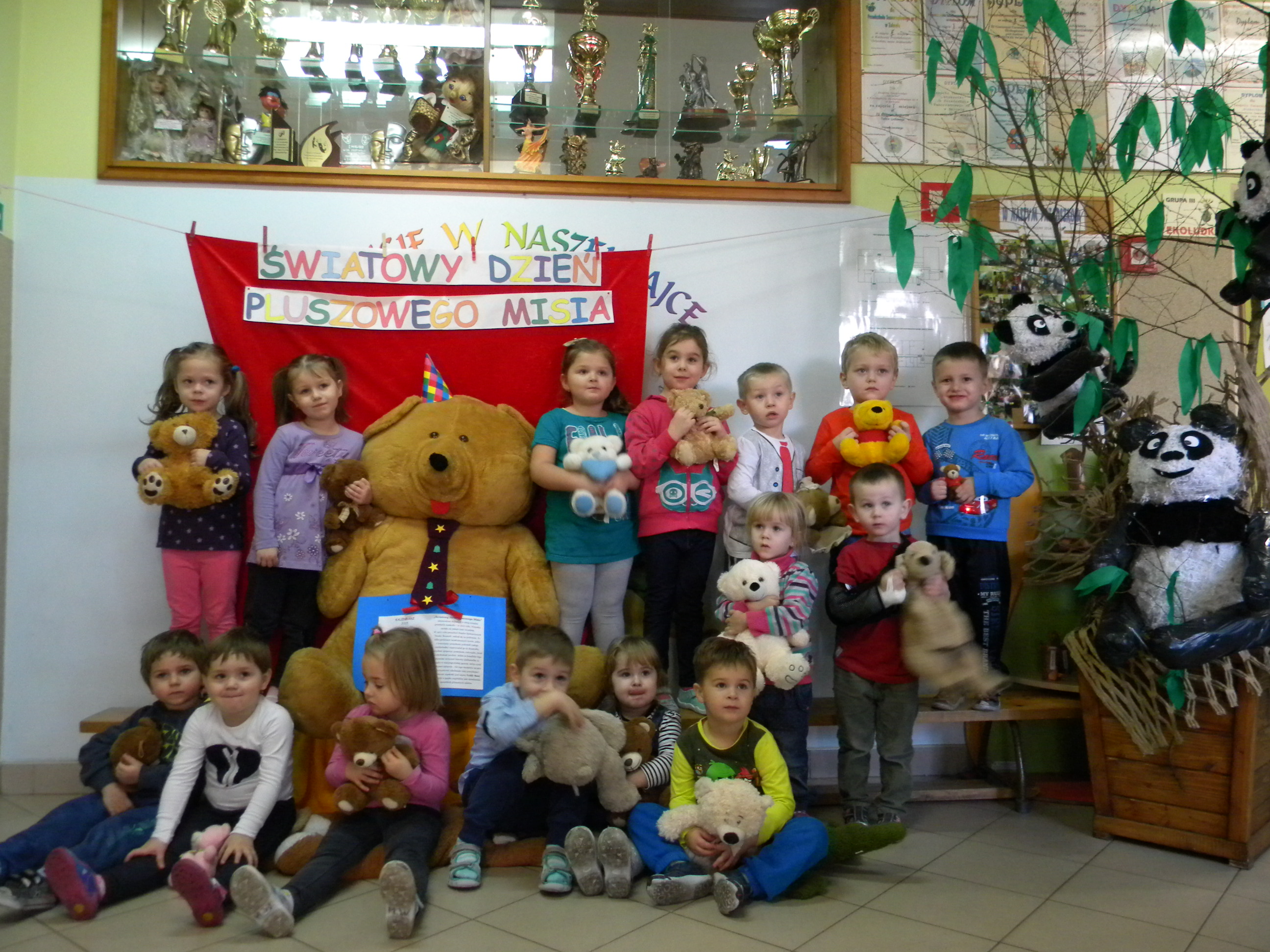 25 listopada to dzień, kiedy na świecie obchodzi się urodziny pluszowego misia. Miś jest przyjacielem dzieci, czy wypada zapomnieć o urodzinach przyjaciela? Z okazji Święta Pluszowego Misia, zorganizowano uroczystość w Samorządowym Przedszkolu nr 4. Każde dziecko przyniosło do przedszkola swojego misia - pluszaka. Zabawka ta towarzyszy dzieciom wiele lat, to nie tylko pluszowa przytulanka, to "ktoś" bardzo bliski, czuły, cierpliwy i często niezastąpiony. Misie towarzyszą dzieciom zarówno w chwilach radości jak i smutku. Są powiernikami dziecięcych tajemnic, ocierają łzy, pomagają zasypiać. Wspólnie z nauczycielkami postanowiłyśmy przybliżyć dzieciom wszystko co wiąże się z misiem.Każdy przedszkolak miał okazję zaprezentować swojego ulubionego „pluszaka”. Takiej dużej pluszowej rodziny jeszcze nie mieliśmy okazji gościć w naszej placówce. W trakcie świętowania poznaliśmy ciekawą historię pluszowego misia i jego twórcy, tańczyliśmy z naszymi misiami, robiliśmy im masaże, śpiewaliśmy sto lat…, chuśtalismy je na chuście, były też konkursy: wylizywanie pysznego miodu z talerza na czas oraz odgadywanie imienia bajkowych Misiaków. Na zakończenie świętowania oglądaliśmy bajkę pt. „Miś Kudłatek” a następnie wykonaliśmy pracę plastyczną pt: „Miś Uszatek”, z wykorzystaniem kół orgiami. Na koniec wszystkie przedszkolaki zrobiły pamiątkowe zdjęcie ze swoimi pluszowymi misiami.