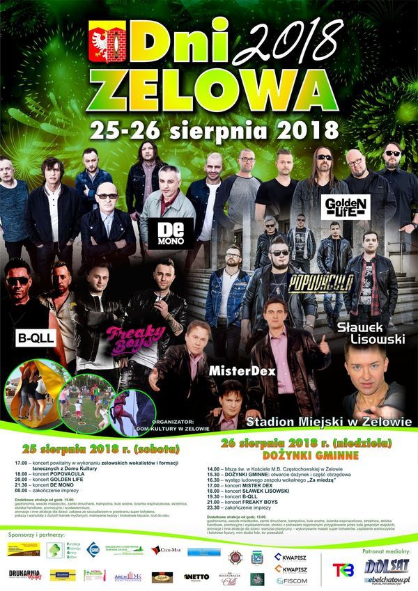 Już w najbliższą sobotę i niedzielę na stadionie zelowskiego "Włókniarza" odbędą się Dni Zelowa i Dożynki Gminne. Dla mieszkańców i gości przygotowano wiele atrakcyjnych stoisk i ciekawy program. Na scenie zapezentują się zelowscy wokaliści i formacje taneczne z Domu Kultury. Pierwszego dnia zaplanowano także koncerty trzech znanych wykonawców takich jak: POPOVACULA, GOLDEN LIFE i DE MONO. W niedzielę uroczystości rozpoczną się akcentem dożynkowym, w tym o godz. 14.00 w kościele M. B. Częstochowskiej odprawiona zostanie Msza Święta dziękczynna, a następnie orszak dożynkowy przejdzie na stadion ZKS "Włókniarz". Tego dnia odbędą się koncerty takich zespołów jak: MISTER DEX, SŁAWEK LISOWSKI, B-QLL I FREAKY BOYS.